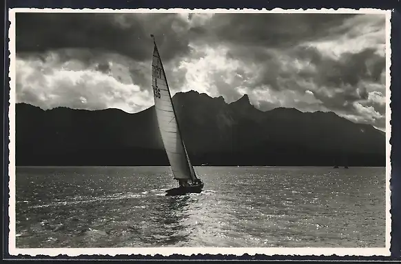 AK Thunersee, Ansicht mit Stockhornkette und Jacht des T. J. C.