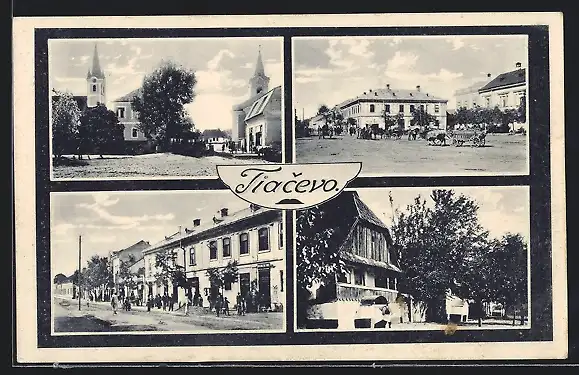 AK Tiacevo, Strassenpartie mit Geschäften, Blick auf zwei Kirchen