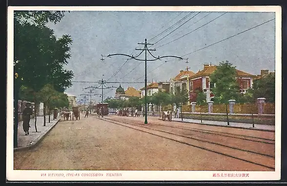 AK Tientsin, Via Vittario, Italian Concession, Strassenbahn