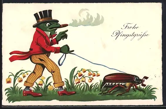 AK Tier in Frack und Zylinder geht mit einem Maikäfer Gassi, Pfingstkarte
