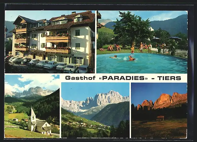 AK Tiers, Gasthof Paradies in zwei Ansichten, Ortsansicht, Kirche und Wegekreuz