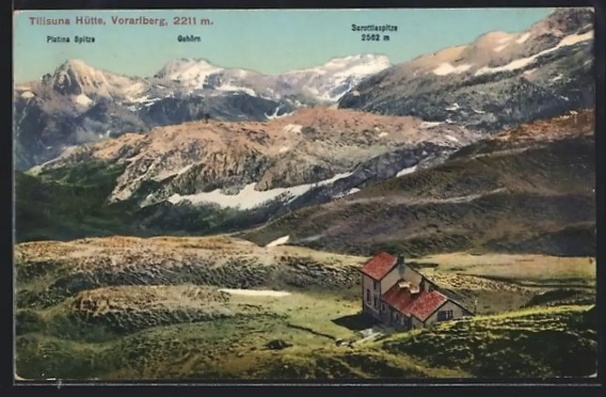 AK Tilisuna Hütte /Vorarlberg, Berghütte mit Platinaspitze, Gehörn u. Sarottlaspitze