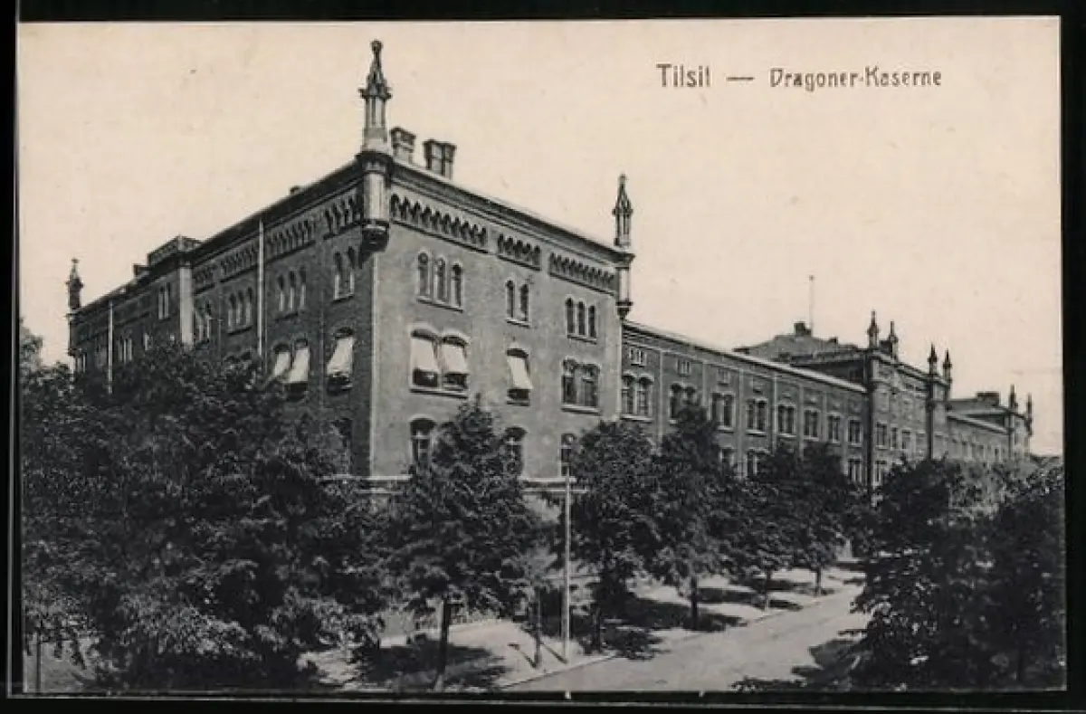 AK Tilsit, Dragoner-Kaserne an einer Strassenecke