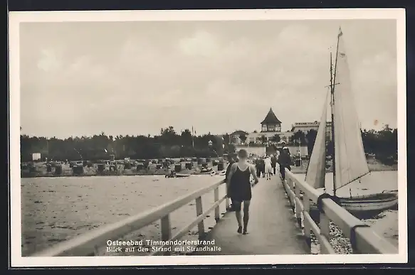 AK Timmendorferstrand, Blick auf den Strand vom Steg aus mit Badegästen und Strandhalle