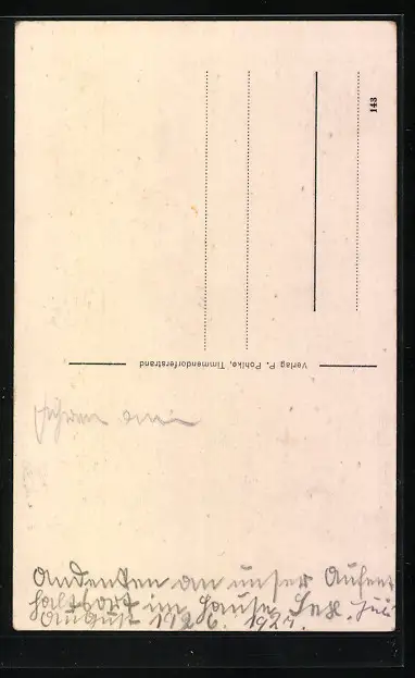Personenbezogene Daten auf der Rückseite der Karte wurden durch blauen Textmarker unkenntlich gemacht. Die blauen Stellen sind auf die Vorderseite durchgeweicht und wirken sich negativ auf das Postkartenfoto aus