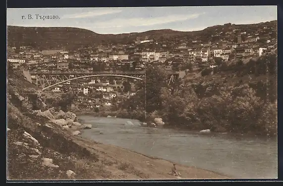 AK Tirnowo, Totalansicht vom Ufer aus mit Brücke