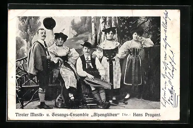 AK Tiroler Ensemble Alpenglühen Hans Pragnant, Trachtenkapelle vor Fotokulisse
