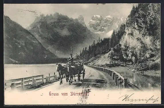 AK Toblach, Dürrensee, Brücke mit Pferdewagen