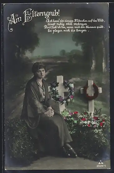 AK Tochter sitzt gedankenverloren am elterlichen Grab