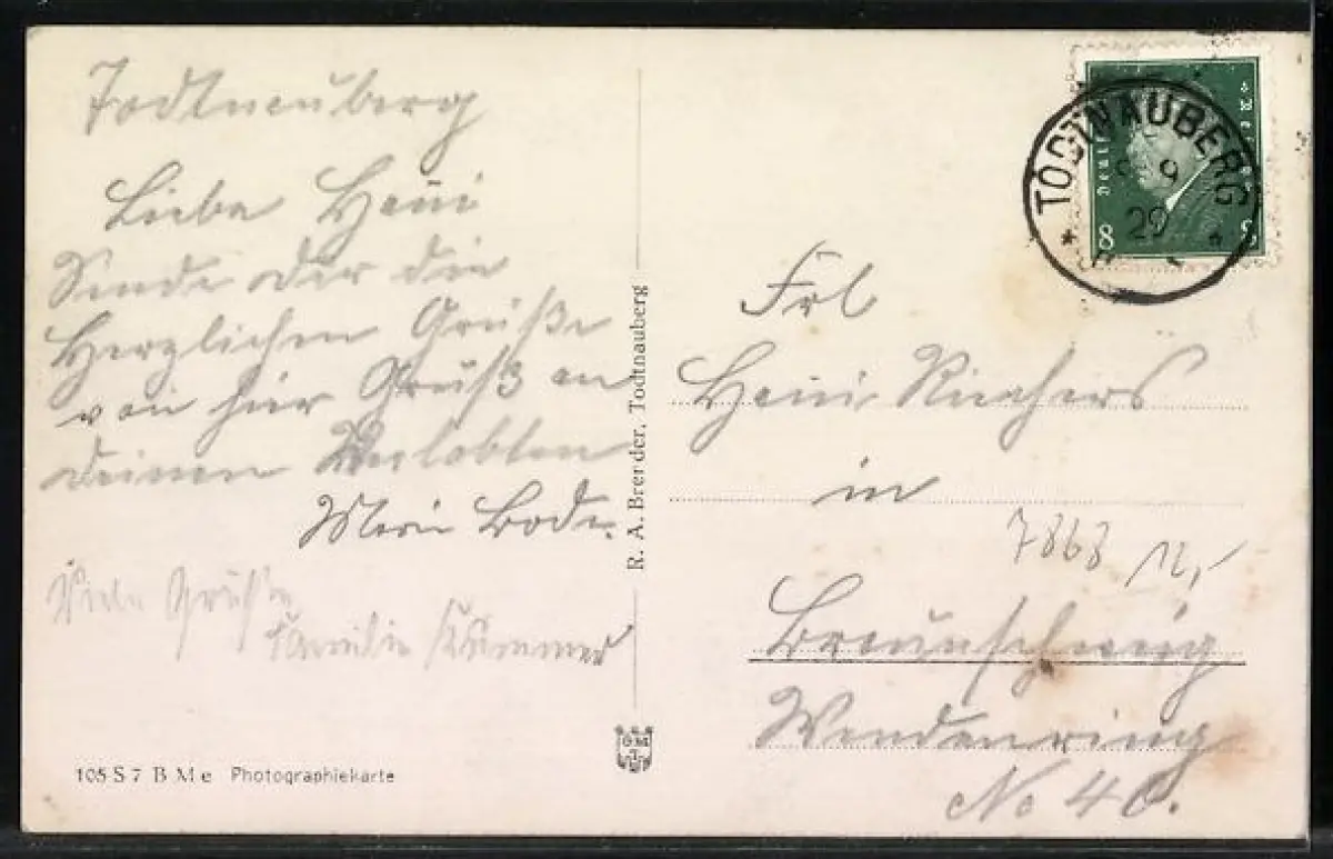 Personenbezogene Daten auf der Rückseite der Karte wurden durch blauen Textmarker unkenntlich gemacht. Die blauen Stellen sind auf die Vorderseite durchgeweicht und wirken sich negativ auf das Postkartenfoto aus