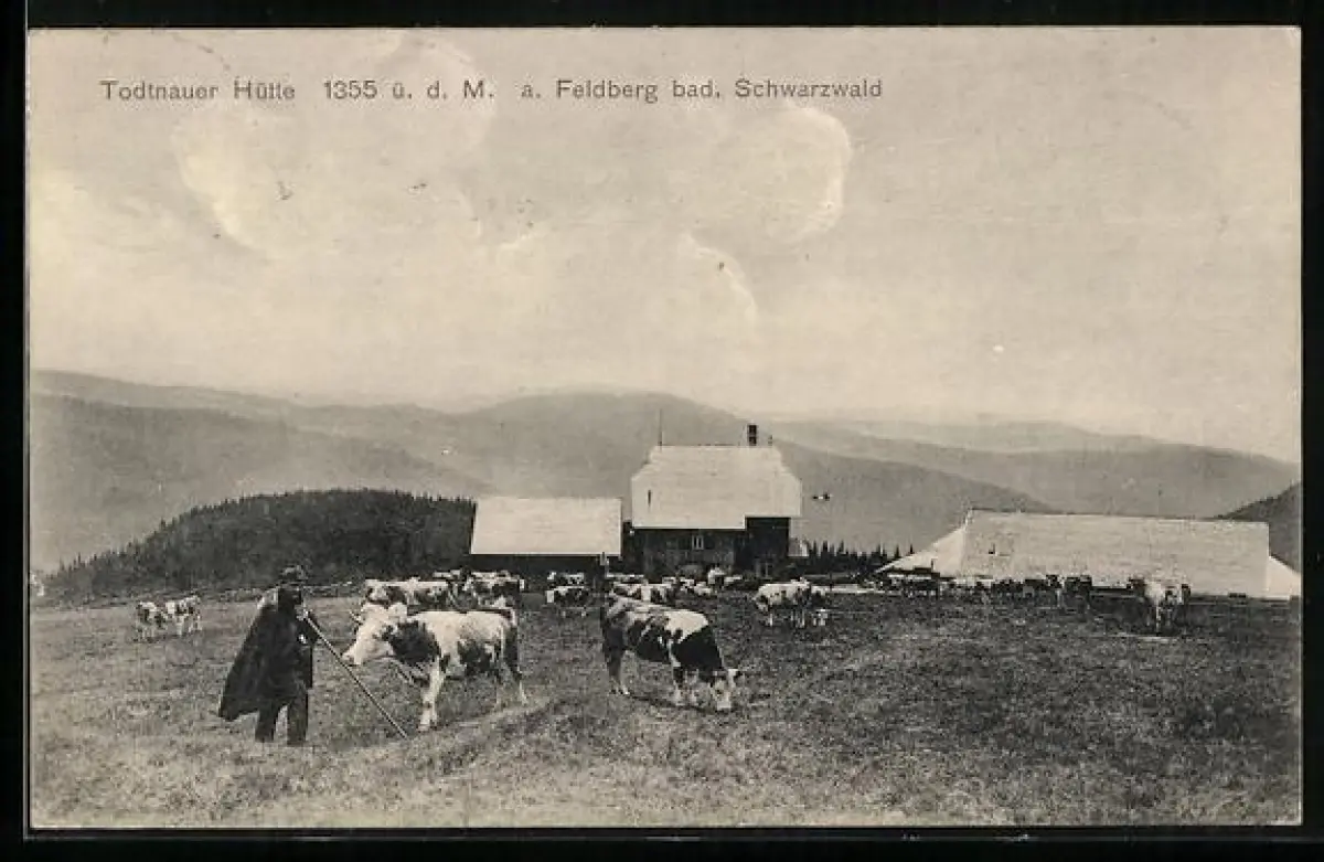 AK Todtnauer Hütte am Feldberg und Hirte mit Kühen