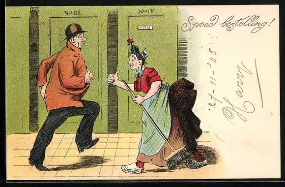 AK Toilettenfrau zeigt eiligem Besucher eine freien Kabine