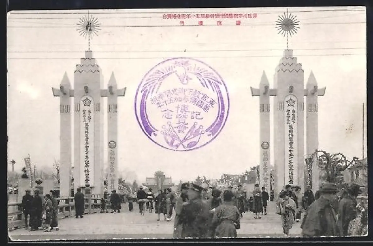 AK Tokyo, Japan Exposition, mit Besuchern und Türmen