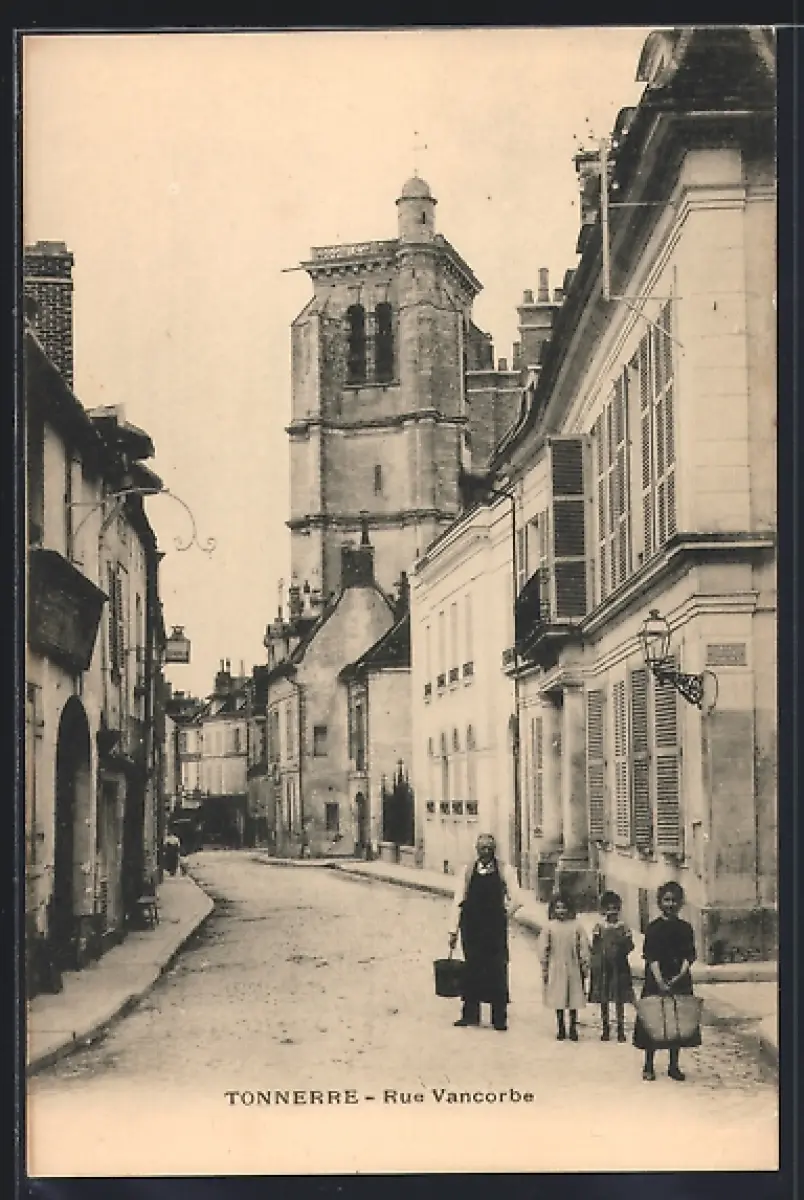 AK Tonnerre, Rue Vancorbe avec vue sur l`église et scène de rue animée