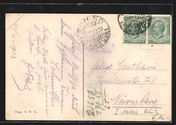 gelaufen 1913, Eckknick re. oben, guter Zustand