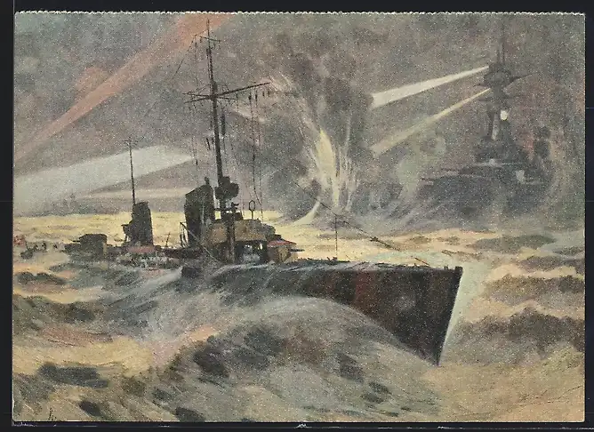 AK Torpedoboot-Nachtangriff auf ein engflisches Schlachtschiff, nach Gemälde von Ahlers
