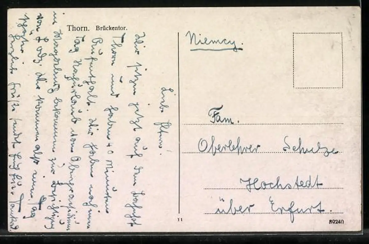 Personenbezogene Daten auf der Rückseite der Karte wurden durch blauen Textmarker unkenntlich gemacht. Die blauen Stellen sind auf die Vorderseite durchgeweicht und wirken sich negativ auf das Postkartenfoto aus