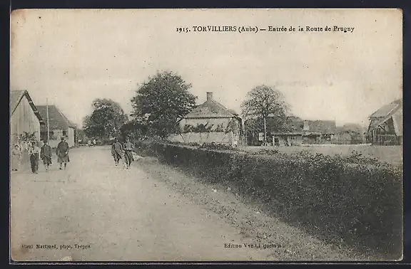 AK Torvilliers, Entrée de la Route de Prugny avec passants et maisons champêtres