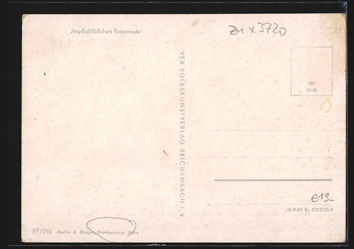 Personenbezogene Daten auf der Rückseite der Karte wurden durch blauen Textmarker unkenntlich gemacht. Die blauen Stellen sind auf die Vorderseite durchgeweicht und wirken sich negativ auf das Postkartenfoto aus