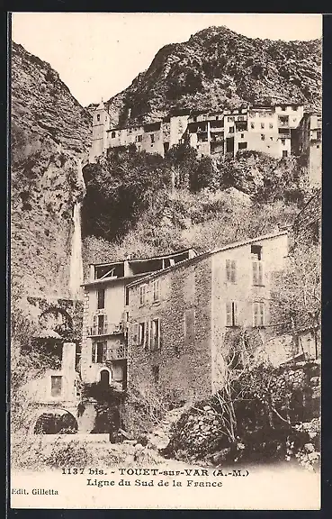 AK Touët-sur-Var, Vue du village pittoresque et cascade impressionnante