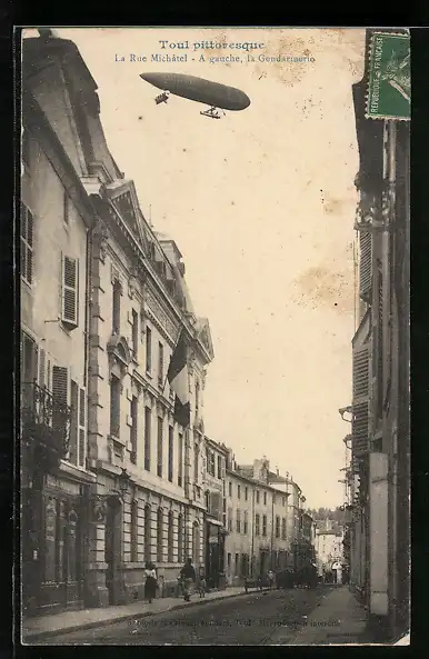 AK Toul, La Rue Michâtel - A gauche, la Gendarmerie, Zeppelin