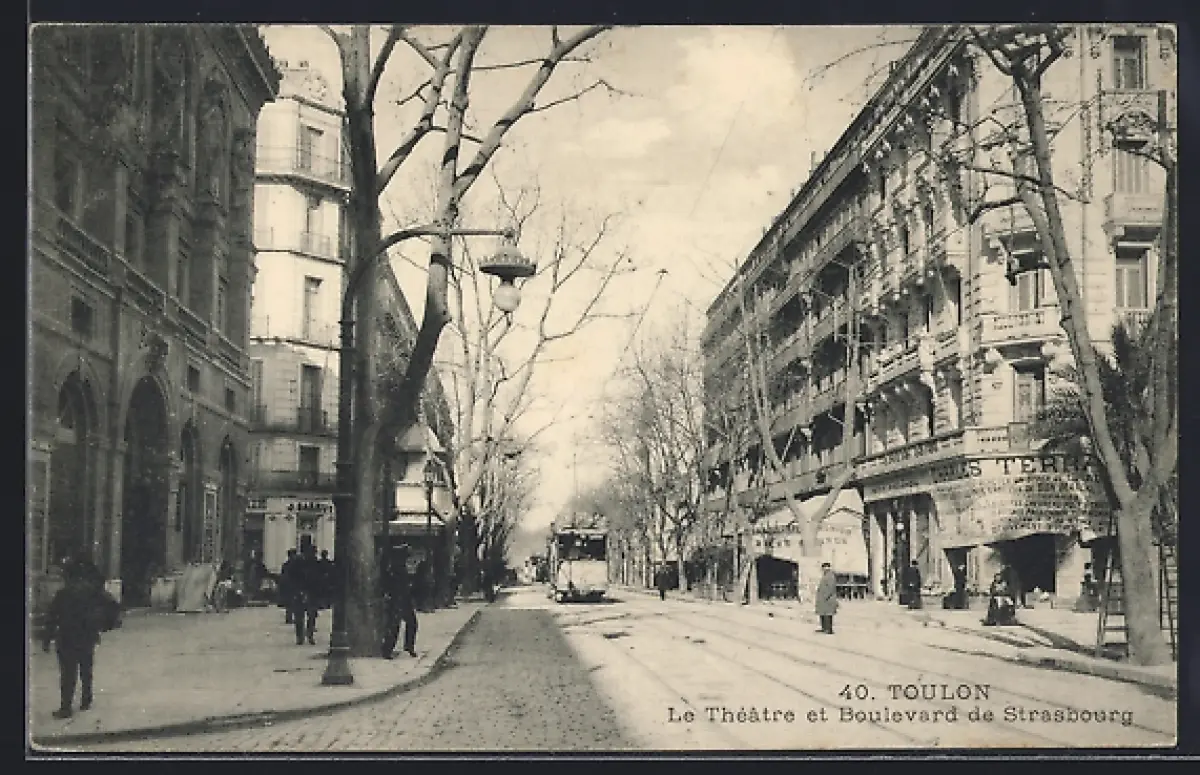 AK Toulon, Le Théâtre et Boulevard de Strasbourg, Strassenbahn