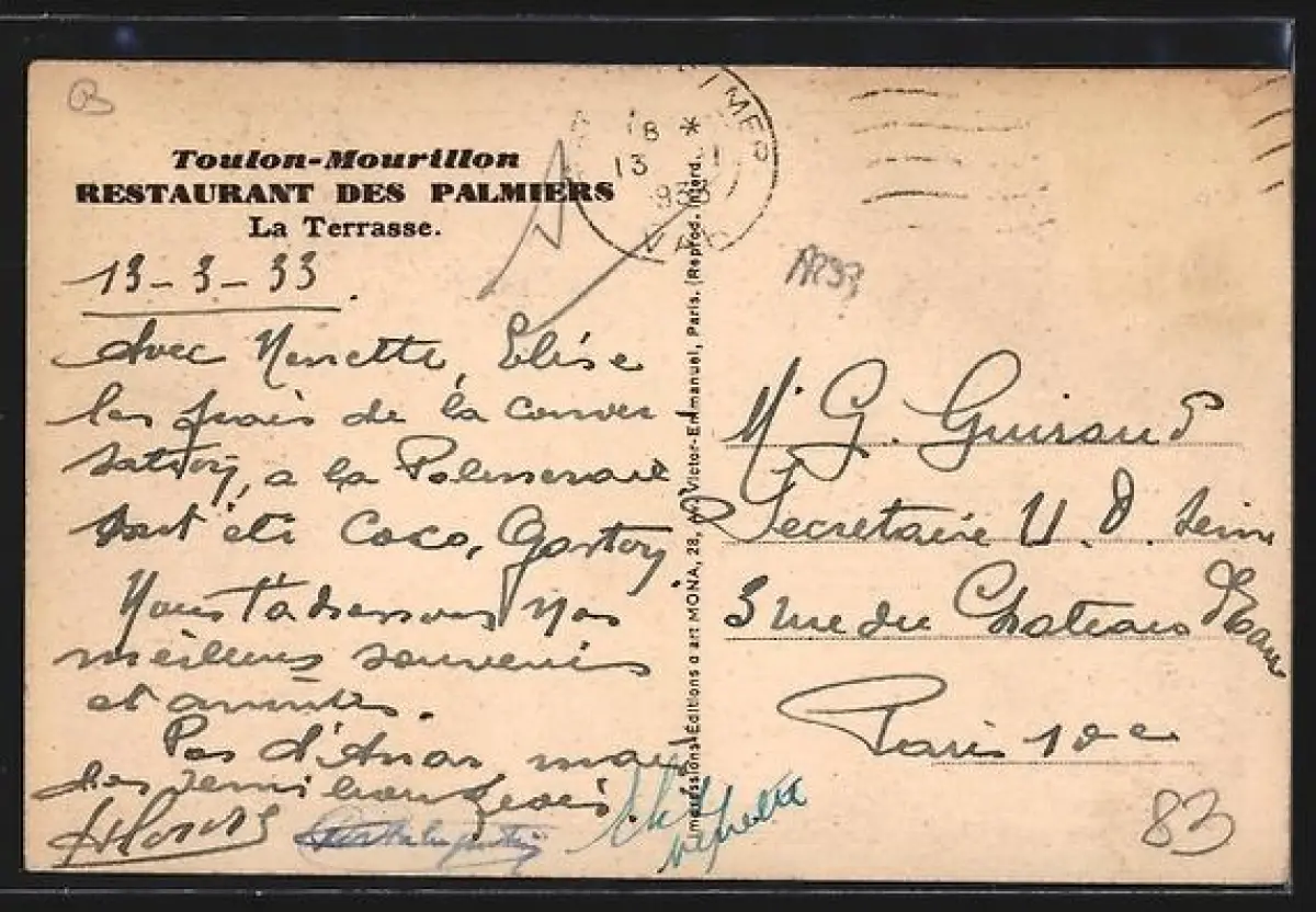 AK Toulon /Mourillon, Restaurant des Palmiers, La Terrasse, vue sur la mer avec palmiers et tables extérieures