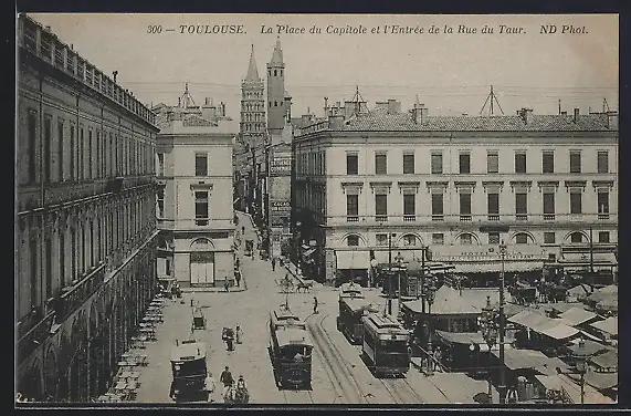 AK Toulouse, La Place du Capitole et l`Entrée de la Rue du Tour, Strassenbahn
