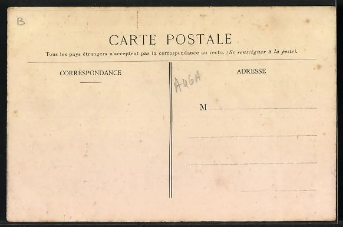 Personenbezogene Daten auf der Rückseite der Karte wurden durch blauen Textmarker unkenntlich gemacht. Die blauen Stellen sind auf die Vorderseite durchgeweicht und wirken sich negativ auf das Postkartenfoto aus