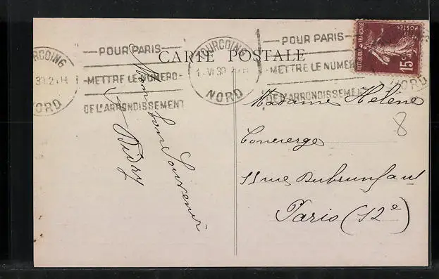 Personenbezogene Daten auf der Rückseite der Karte wurden durch blauen Textmarker unkenntlich gemacht. Die blauen Stellen sind auf die Vorderseite durchgeweicht und wirken sich negativ auf das Postkartenfoto aus
