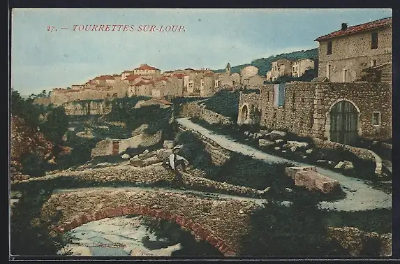 AK Tourrettes-sur-Loup, Vue du village et des anciens remparts avec pont en pierre