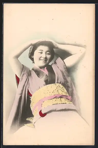 AK Traditionell gekleidete lachende Japanerin, Portrait