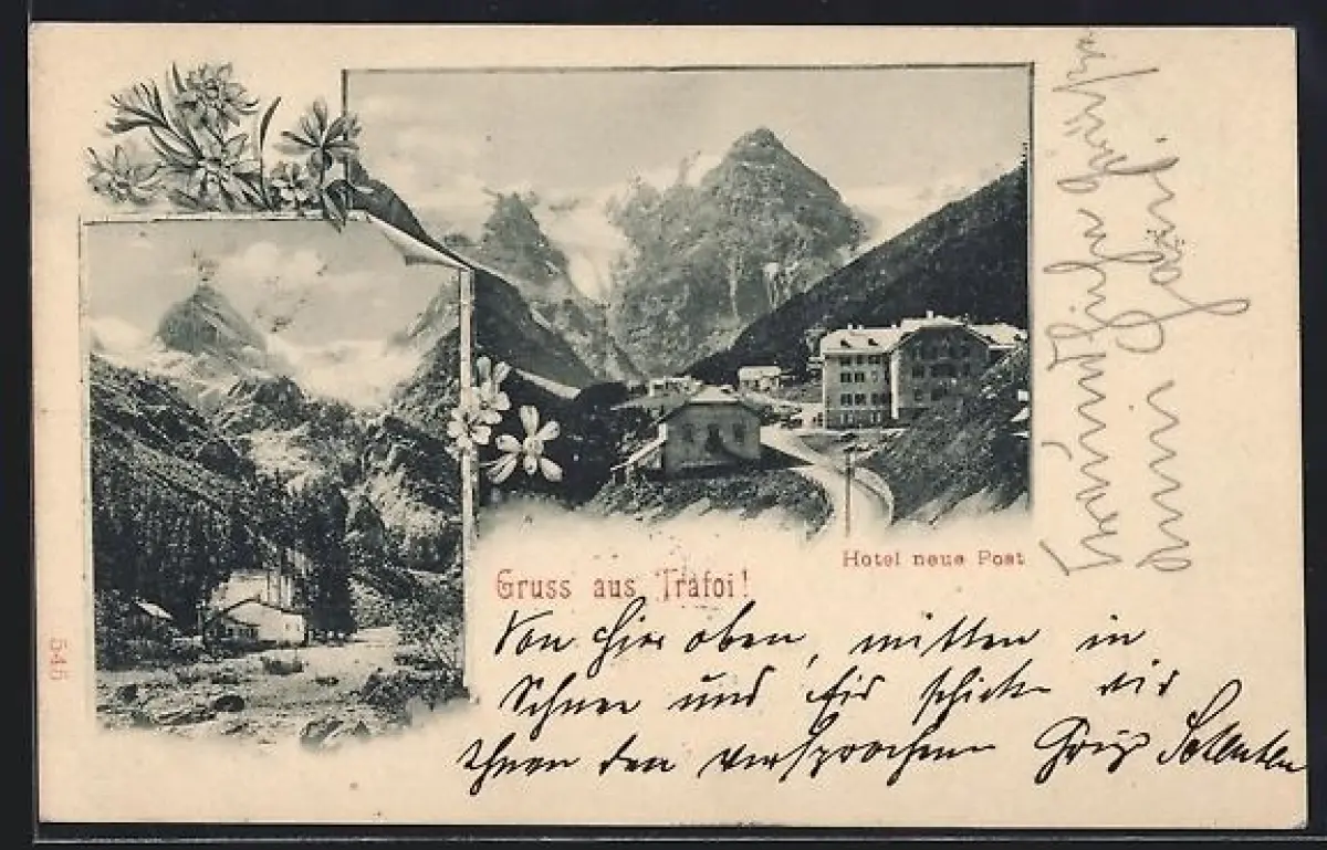 AK Trafoi, Strassenpartie mit Hotel neue Post