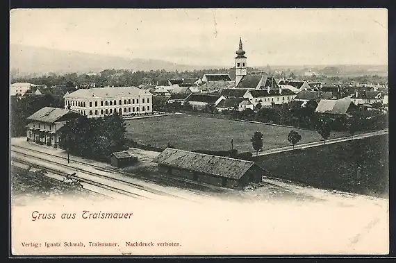 AK Traismauer, Teilansicht mit Kirche und Bahnhof