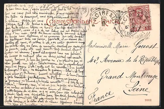 gelaufen 1907, Eckknick oben re., geklebter Einriss oben Mitte, rückseitig Klebe- und Papierreste, guter Zustand