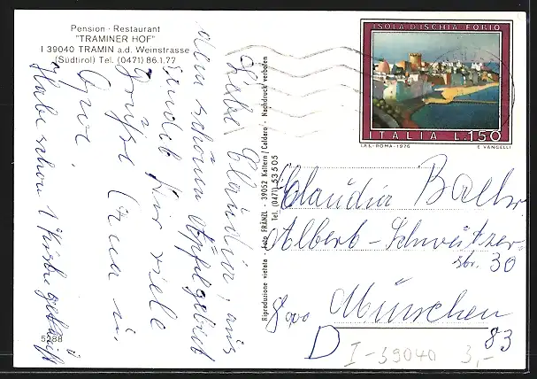AK Tramin a. d. Weinstrasse, Pension-Restaurant Traminer Hof mit Innenansicht u. Swimmingpol, Ortsansicht