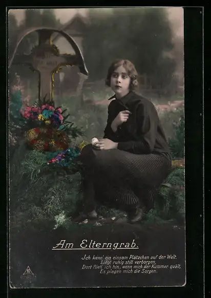 AK Trauernde Frau am Elterngrab, Ich kenn` ein einsam Plätzchen auf der Welt...