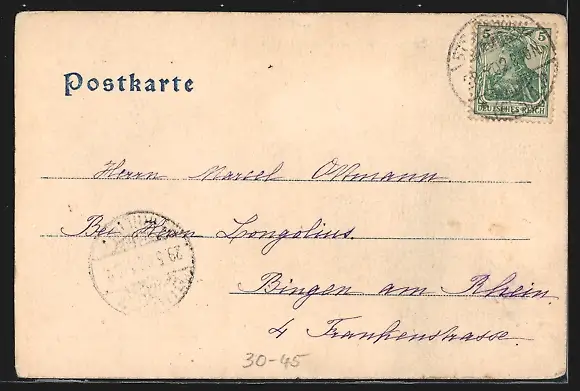 Personenbezogene Daten auf der Rückseite der Karte wurden durch blauen Textmarker unkenntlich gemacht. Die blauen Stellen sind auf die Vorderseite durchgeweicht und wirken sich negativ auf das Postkartenfoto aus