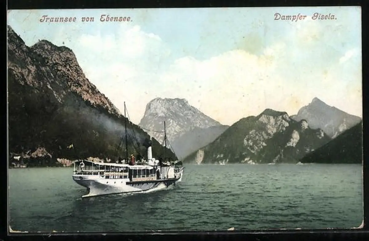AK Traunsee, Raddampfer Gisela und Blick auf das Bergpanorama