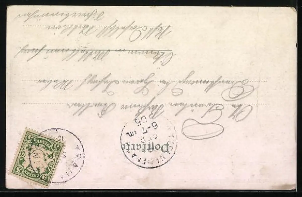 alte Ansichtskarte, gelaufen 1905, Eckknicke li. oben u. re., Bugspur li. mittig, guter Zustand