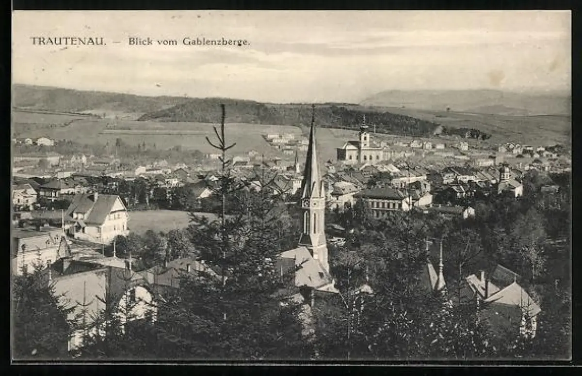 AK Trautenau, Blick vom Gablenzberge mit Kirche