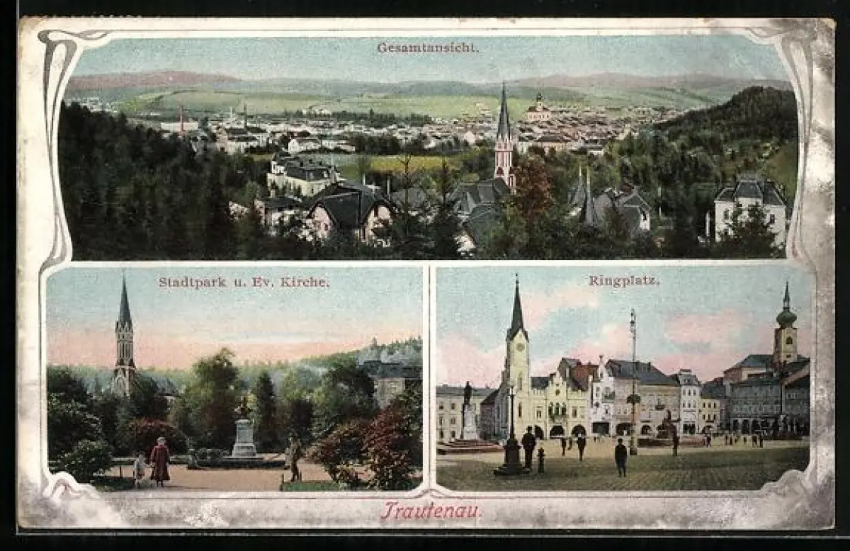 AK Trautenau, Gesamtansicht, Stadtpark und Evangelische Kirche, Ringplatz