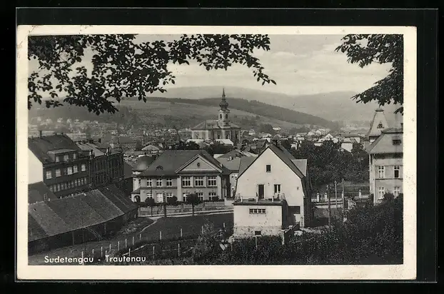 AK Trautenau / Trutnov, Häuserpartie und Blick zur Kirche