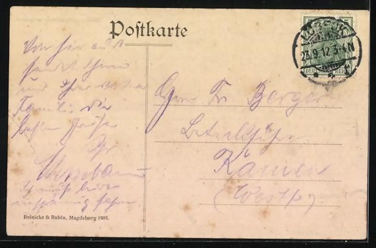 alte Ansichtskarte, gelaufen 1912, Stempelspur, Bugspur re., guter Zustand