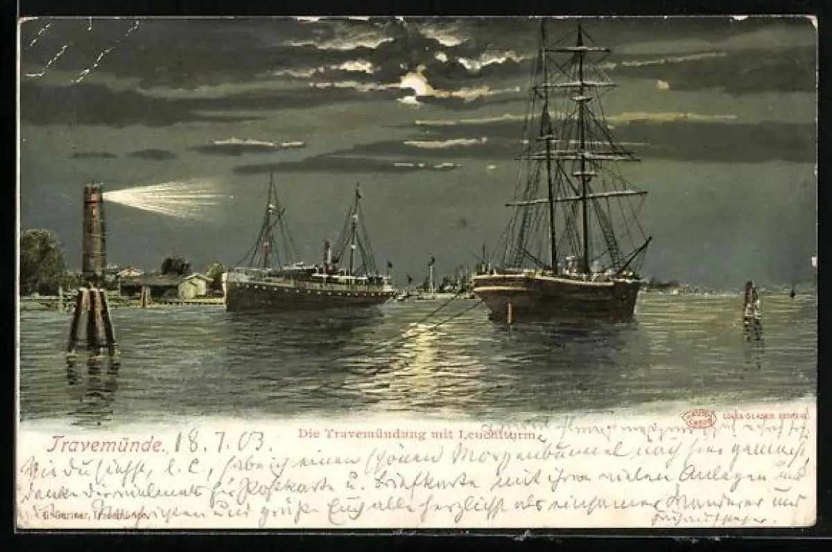 AK Travemünde, Travemündung mit Leuchtturm bei Nacht, einlaufender Passagierdampfer