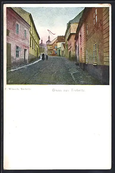 AK Trebnitz, Strassenpartie mit entferntem Kirchturm