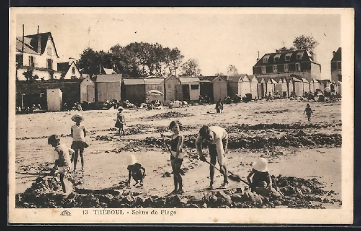 AK Tréboul, Scène de plage animée avec enfants jouant dans le sable devant les cabines de bain