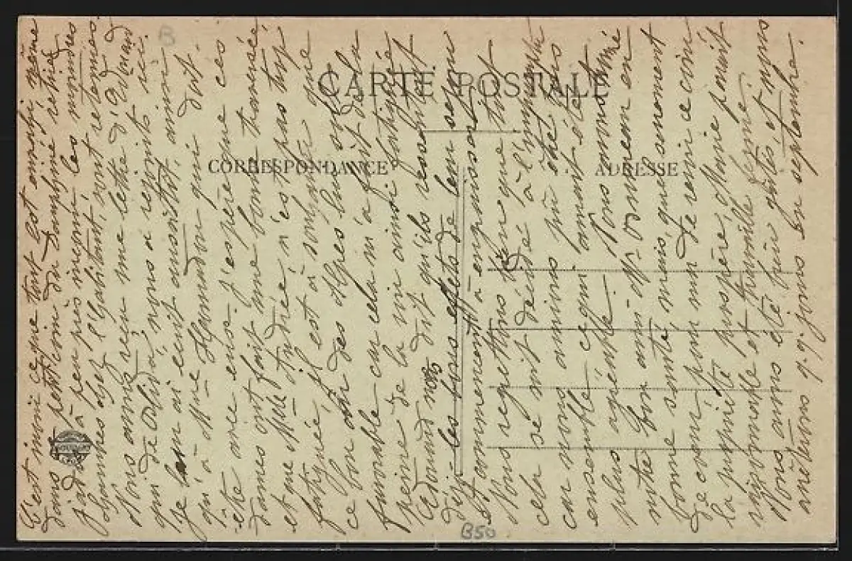 Personenbezogene Daten auf der Rückseite der Karte wurden durch blauen Textmarker unkenntlich gemacht. Die blauen Stellen sind auf die Vorderseite durchgeweicht und wirken sich negativ auf das Postkartenfoto aus
