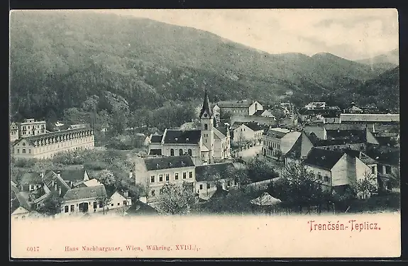 AK Trencsén-Teplicz, Strassenpartie mit Kirche
