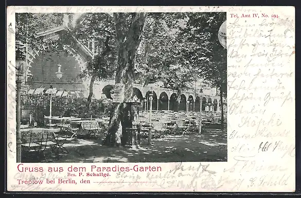 AK Treptow bei Berlin, Gasthof Paradies-Garten, Bes. F. Schallge